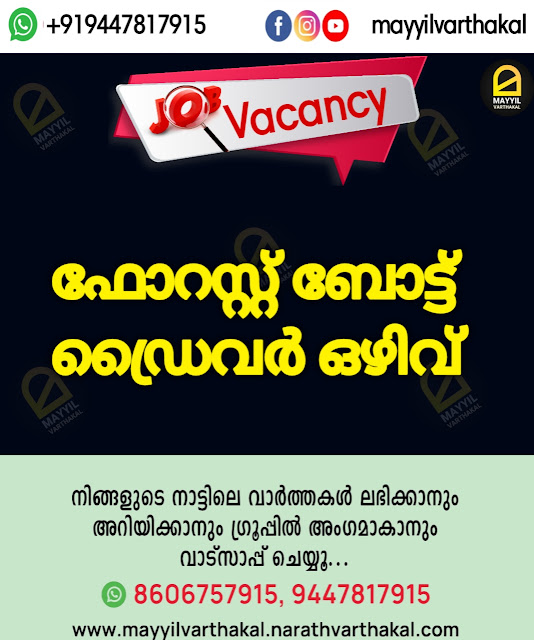 കോഴിക്കോട് ജില്ലയിലെ ഒരു സർക്കാർ സ്ഥാപനത്തിന് കീഴിൽ ഓപ്പൺ പ്രയോറിറ്റി വിഭാഗത്തിനായി സംവരണം ചെയ്ത ഫോറസ്റ്റ് ബോട്ട് ഡ്രൈവർ തസ്തികയിൽ് താല്ക്കാലിക ഒഴിവ് നിലവിലുണ്ട്. യോഗ്യത : എസ്എസ്എൽസി അല്ലെങ്കിൽ തത്തുല്യ യോഗ്യത, മോട്ടോർ ബോട്ട് ഡ്രൈവിങ് ലൈസൻസും രണ്ട് വർഷത്തിൽ കുറയാത്ത പ്രവൃത്തി പരിചയവും, മോട്ടോർ ബോട്ടിന്റെ റിപ്പയർ സംബന്ധിച്ച് അടിസ്ഥാന സാങ്കേതിക പരിജ്ഞാനം, നീന്തൽ അറിഞ്ഞിരിക്കണം. ഉയരം -168 സെ.മീ, നെഞ്ചളവ് 81 സെ.മീ 5 സെ.മീ എക്സ്പാൻഷൻ എന്നീ ശാരീരിക യോഗ്യതകൾ ഉണ്ടായിരിക്കേണ്ടതാണ്. (പട്ടികജാതി / പട്ടിക വർഗ ഉദ്യോഗാർത്ഥികൾക്ക് ഉയരം 160 സെ.മീ, നെഞ്ചളവ് 81 സെ.മീ 5 സെ.മീ എക്സ്പാൻഷൻ) .പ്രായം : 25-41, ശമ്പളം - 26500 - 60700 രൂപ. യോഗ്യരായ ഉദ്യോഗാർത്ഥികൾ പ്രായം, വിദ്യാഭ്യാസ യോഗ്യത, പ്രവൃത്തി പരിചയം എന്നിവ തെളിയിക്കുന്നതിനുളള അസൽ സർട്ടിഫിക്കറ്റുകൾ സഹിതം മാർച്ച് അഞ്ചിനകം അടുത്തുളള എംപ്ലോയ്മെന്റ് എക്സ്ചേഞ്ചിൽ നേരിട്ട് ഹാജരായി പേര് രജിസ്റ്റർ ചെയ്യണമെന്ന് ജില്ലാ എംപ്ലോയ്മെന്റ് ഓഫീസർ അറിയിച്ചു.